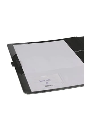 Beschriftungsetikett, Stiftschlaufe und Einstecktasche im Vorderdeckel