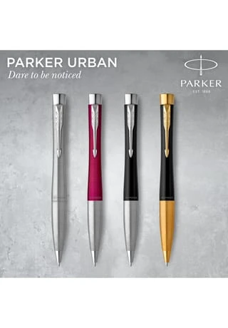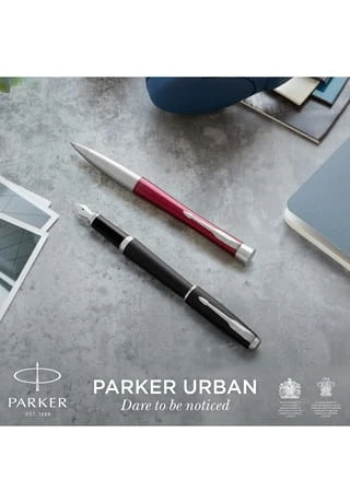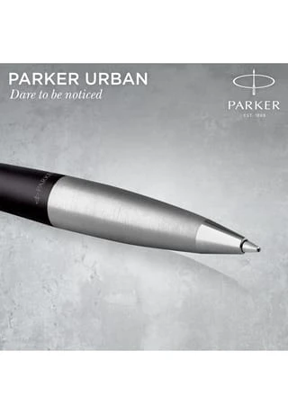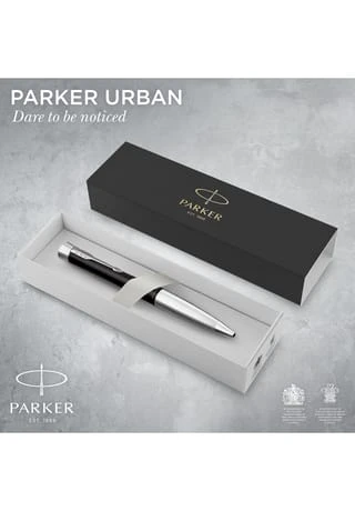Parker URBAN. Produktfarbe: Schwarz, Edelstahl, Schreibfarben: Blau, Typ: Kugelschreiber mit Druckeinzugsmechanik. Menge pro Packung: 1 Stück(e), Verpackungsart: Geschenkbox