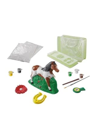 Mit diesem Kreativ-Set können kleine und große Pferdefreunde ihre Liebe zu diesen anmutigen Tieren mit wunderschönen und von eigener Hand bemalten Gipsfiguren Ausdruck verleihen. Das geht ganz einfach in nur drei Schritten! Dazu wird der Gips aus dem Set entsprechend der Anleitung angerührt und in die Gießform gefüllt. Das gelingt so einfach, dass Kinder die Gipsfiguren mit und ohne Unterstützung der Eltern gießen können. Kleine und große Pferdefans werden ihren Spaß daran haben und zu eifrigen Gipskünstlern werden. Nach dem Trocknen wird die noch weiße Figur aus der Form genommen und nach eigenem Geschmack bemalt. Dazu liegen leicht aufzutragende Acrylfarben der Packung bei. Mit dem Gießset sind 2 Gießformen enthalten, mit denen insgesamt 8 Figuren gestaltet und bemalt werden können – neben dem Pferd auch eine Blume, ein Hufeisen oder ein Reitabzeichen. Die beiden Gießformen lassen sich mit dem beigefügten Gips je zweimal befüllen. Der besondere Reiz am Gipsgießen ist die Freude am anschließenden Bemalen. Mit Pinsel, Acrylfarben und etwas kreativem Geschick lassen sich die verschiedensten Fellfarben und Muster auf den Gipskörper zaubern. Auch das Hufeisen und die anderen Figuren können frei nach der eigenen Fantasie gestaltet werden. Der Gestaltungsfreude und Kreativität der Kinder sind dabei keine Grenzen gesetzt. So leicht können kleine Gipskünstler ihre Lieblingstiere gestalten. Achtung: Anweisung vor Gebrauch lesen, befolgen und nachschlagebereit halten. Die Farben enthalten Reaktionsmasse aus 5-Chlor-2- methyl-2H-isothiazol-3-on und 2-Methyl-2H-isothiazol-3-on (3:1). Kann allergische Reaktionen hervorrufen.