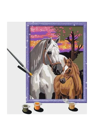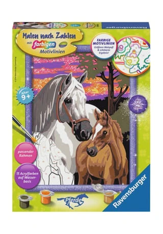 Farbige Motivlinien: Größerer Malspaß & ein schöneres Ergebnis Dank der farbigen Motivlinien, können die Kinder das ganze Motiv Pferde im Sonnenuntergang und die Farben schneller erkennen. Der Pinsel hat eine gute Führung und so entsteht nach und nach ein perfektes Bild.Die schönen Motive zum Ausmalen sind eine tolle Geschenkidee für Kinder ab 9 Jahren und eine schöne Dekoration für das Kinderzimmer. In diesem Malset sind bereits 15 fertig gemischte Acrylfarben enthalten.Mit Malen nach Zahlen von Ravensburger lernen die Kinder Flächen sorgfältig auszumalen, ihr Maltalent zu verbessern sowie feinmotorische Fähigkeiten zu entwickeln. Am Ende stehen Freude, Stolz und ein Erfolgserlebnis, das die Lust am Weitermalen weckt.Die Motive sind altersgerecht in drei Schwierigkeitsstufen umgesetzt: von einfachen Bildern mit wenigen, großen Malflächen bis hin zu Bildern mit vielen, kleinen Malflächen für Fortgeschrittene.Jedes Malset enthält alles, was Künstler zum Malen brauchen und es ist kein Mischen der Farben notwendig. Zusätzlich zur Maltafel, zu den Farben und zum Pinsel, ist in diesem Malset funkelnder Glitter enthalten. Sobald das Motiv fertig ausgemalt ist, wird der Glitter angemischt und aufgetragen. So entsteht wird das Motiv zum Glitzern gebracht.Das Ravensburger Malen nach Zahlen Programm bietet eine große Motivauswahl für Kinder und Erwachsene.