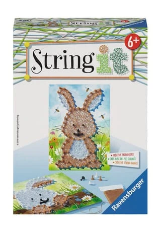 Mit dem Ravensburger String it-Set Rabbit erlernen bereits Kinder ab 6 Jahren die beliebte Technik String Art. Hier werden keine Nägel eingeschlagen, sondern Kunststoffpins eingedrückt. Sind alle Pins gesteckt, werden auf der Vorderseite der Tafel die bunten Fäden ganz nach Belieben kreuz und quer gespannt, bis das Fadengeflecht das Motiv erscheinen lässt. Wann das Fadenbild fertig ist, entscheidet jeder selbst. String Art ist wieder voll im Trend. Mit dem Ravensburger String it-Set erlernen bereits Grundschulkinder die beliebte Technik. Das geht ganz einfach: Auf der Rückseite der Motivtafeln sind die Löcher farbig umrandet, entsprechend der vorgesehenen Pin-Farbe. Sind alle Pins gesteckt, werden auf der Vorderseite der Tafel die farblich passenden Fäden ganz nach Belieben kreuz und quer gespannt, bis das Fadengeflecht das Motiv erscheinen lässt. Wann das Bild fertig ist, entscheidet jeder selbst. Das Netz kann dabei ganz dicht sein oder auch mit vielen Zwischenräumen. Im Set enthalten sind Kunststoffpins in unterschiedlichen Farben, zwei Motivtafeln mit Vorlage sowie Garn auf Haspeln in verschiedenen Farben.