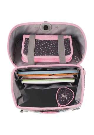 7-teiliges Schulranzen-Set von School-Mood, bestehend aus Schulranzen, Sportbeutel/Turnbeutel, Schüleretui (21-tlg.), Schlamperrolle, Brustbeutel, Brotdose und 3 Patchies. Klassischer Schulranzen der Hero Air+ Serie ist robust, wasserabwesend, leicht zu reinigen und lässt keine Wunsche offen. Selbstschließender Magnetverschluss ermöglicht ein kinderleichtes Öffnen und Schließen des Deckels. Das mitwachsende, ergonomisch geformte Tragesystem mit Brust- und Beckengurt bietet hervorragenden Tragekomfort und optimalen Sitz. Im Inneren ist der Schulranzen bestens ausgestattet und bietet Ordnung, Übersicht und viel Stauraum für Hefte, Bücher, Federmäppchen, Brotdose usw. Reflektierende Elemente sorgen für Sicherheit bei Dunkelheit. Mit wechselbaren Patchies für Motivaustausch lässt sich der Schulranzen immer neu und individuell gestalten. Dank integrierter Halterung kann der Sportbeutel am Schulranzen befestigt werden. Etui ist komplett bestückt (21tlg.) und verfügt über einen Stundenplan. Schulranzen Außenmaß: 28 cm x 22 cm x 36 cm / Gewicht: ca. 900 g / Volumen: ca. 20 l