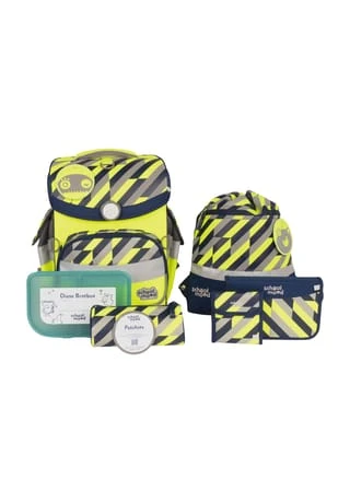7-teiliges Schulranzen-Set von School-Mood, bestehend aus Schulranzen, Sportbeutel/Turnbeutel, Schüleretui (21-tlg.), Schlamperrolle, Brustbeutel, Brotdose und 3 Patchies. Klassischer Schulranzen der Timeless Air+ Serie ist robust, wasserabwesend, leicht zu reinigen und lässt keine Wunsche offen. Selbstschließender Magnetverschluss ermöglicht ein kinderleichtes Öffnen und Schließen des Deckels. Das mitwachsende, ergonomisch geformte Tragesystem mit Brust- und Beckengurt bietet hervorragenden Tragekomfort und optimalen Sitz. Im Inneren ist der Schulranzen bestens ausgestattet und bietet Ordnung, Übersicht und viel Stauraum für Hefte, Bücher, Federmäppchen, Brotdose usw. Reflektierende Elemente sorgen für Sicherheit bei Dunkelheit. Mit wechselbaren Patchies für Motivaustausch lässt sich der Schulranzen immer neu und individuell gestalten. Dank integrierter Halterung kann der Sportbeutel am Schulranzen befestigt werden. Etui ist komplett bestückt (21tlg.) und verfügt über einen Stundenplan. Schulranzen Außenmaß: 30 cm x 24 cm x 42 cm / Gewicht: ca. 980 g / Volumen: ca. 23 l